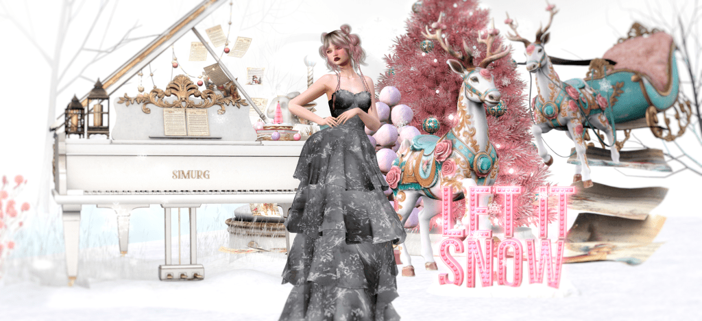 This one lives in pale pink skies, porcelain trees, and melodies that seem to float in the air. A piano waits beneath falling pages, a carousel deer carries faded roses, and everything feels as if it belongs to a forgotten music box, softly opened after years of silence.
